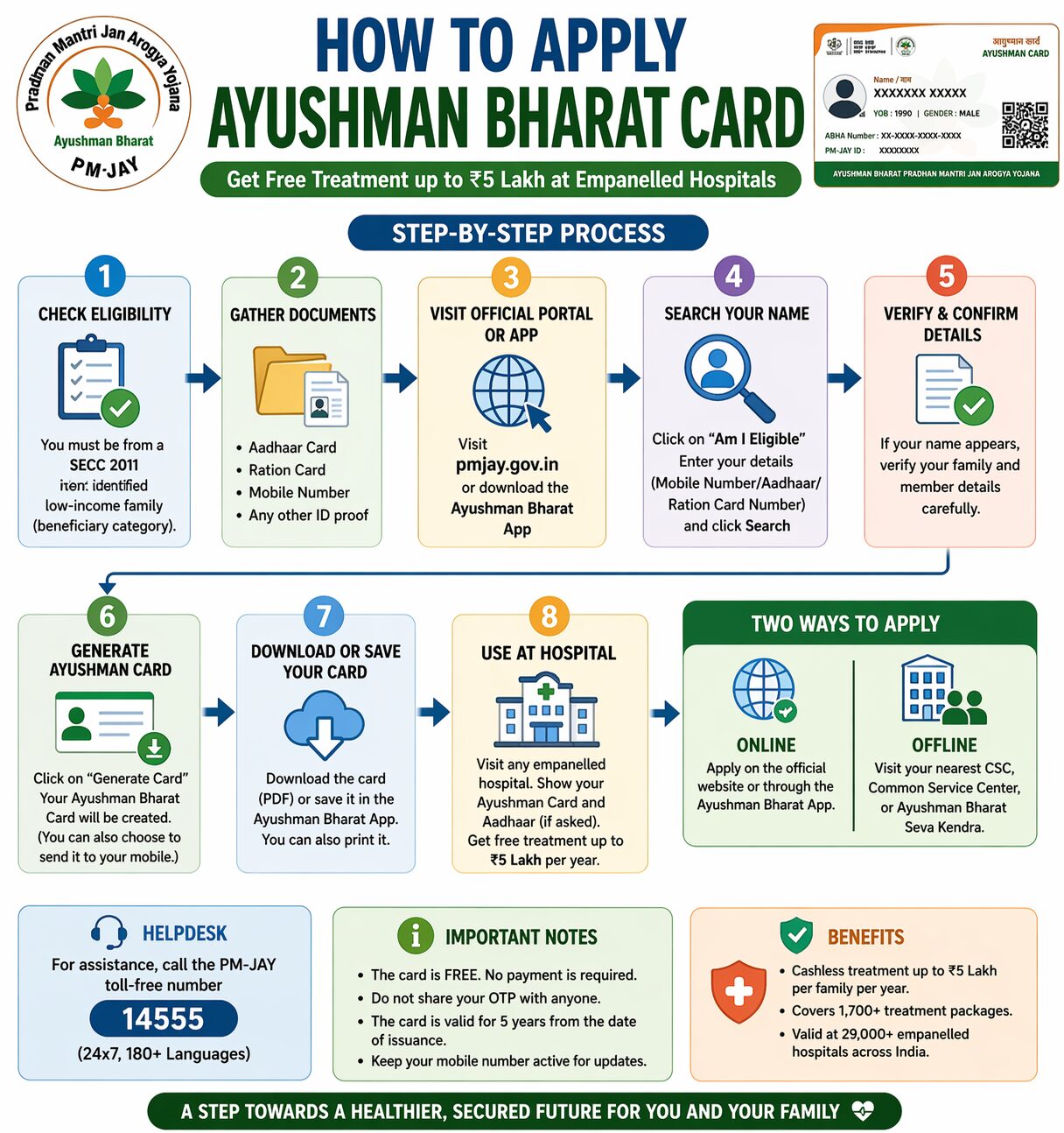 The Ayushman Bharat Card is a powerful initiative that ensures healthcare access for millions of families in India. Applying for it is simple, whether online through the National Health Authority portal, via CSC centers, or at hospitals.