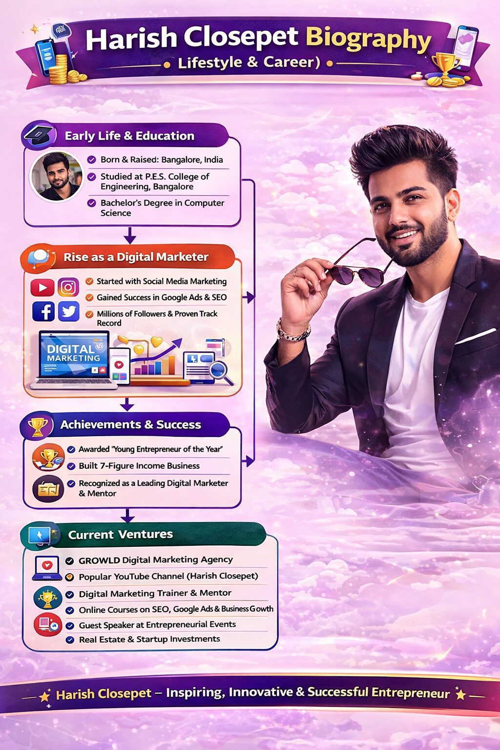 Harish Closepet has gained significant popularity on platforms like LinkedIn and YouTube, where he shares insights on entrepreneurship, career growth, and personal development.