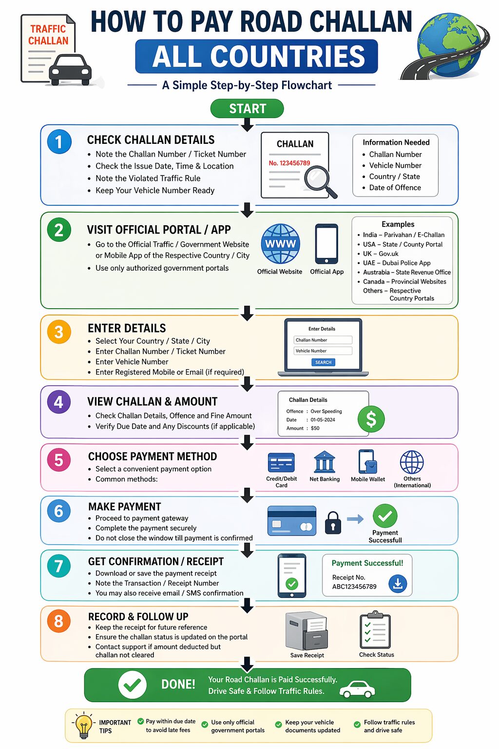 Paying a road challan is no longer the tedious chore it used to be. Whether you are dealing with the e-Challan system in India, fighting an FPN in the UK, or paying a citation in the USA, government portals have made the process seamless. Always ensure you are using official government links (ending in .gov, .gov.in, .gov.uk, etc.) to avoid phishing scams, and never ignore a traffic ticket, as penalties increase significantly over time!