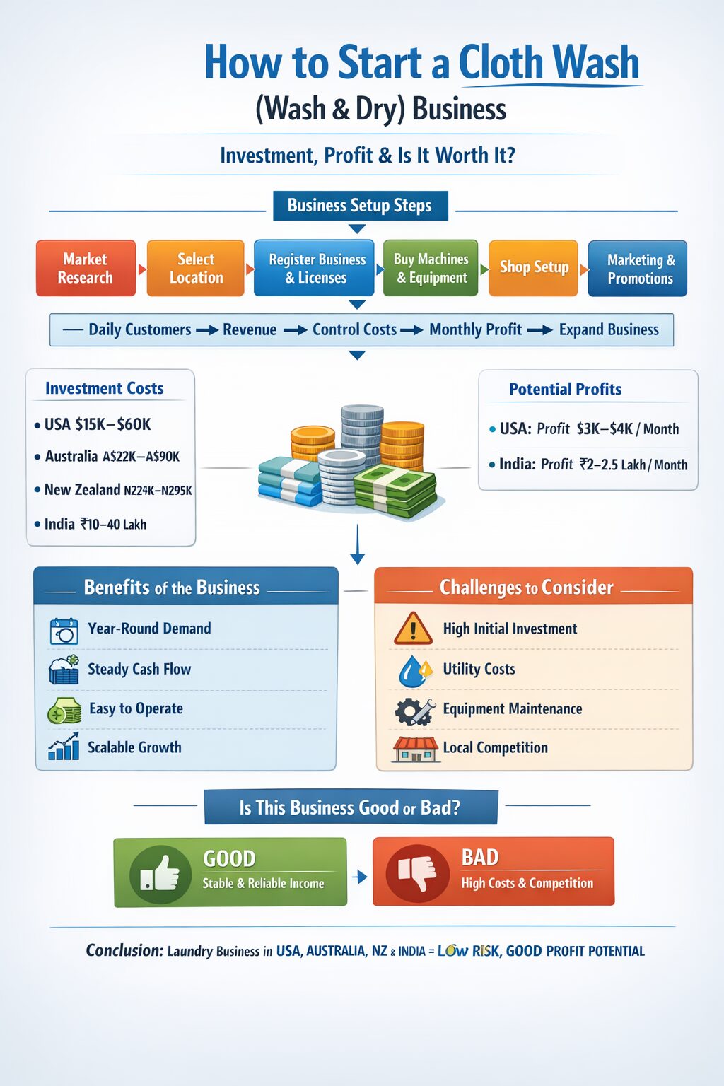 Whether you are investing in the US, Australia, New Zealand, or India, the laundry business remains one of the most dependable service industries. If you want a stable business with daily earnings and low risk, this is definitely worth considering.