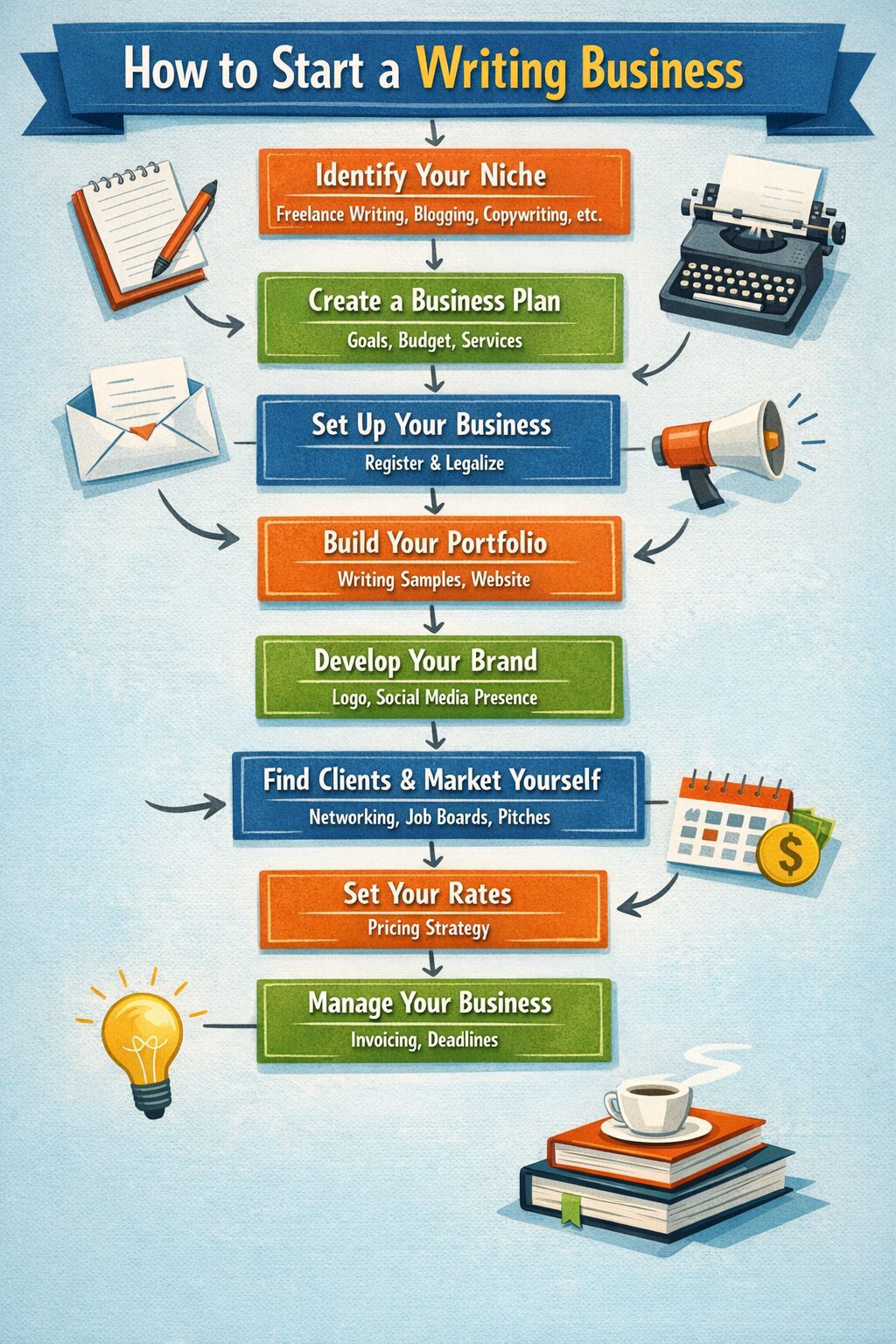 To succeed in a writing business, you must develop excellent writing skills. Focus on clarity, grammar, storytelling, and research. Practice writing daily and study successful blogs in your chosen niche. A strong portfolio is essential to showcase your expertise. Create at least 5–8 high-quality samples that demonstrate different writing styles and formats.