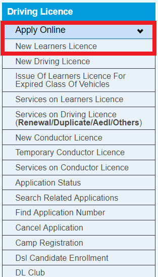 Step 4:┬аLeft Side┬ардореЗрдВ рджрд┐рдП рдЧрдП Apply Online рдореЗрдВ ”New Learners License” Select┬ардХрд░реЗрдВ
