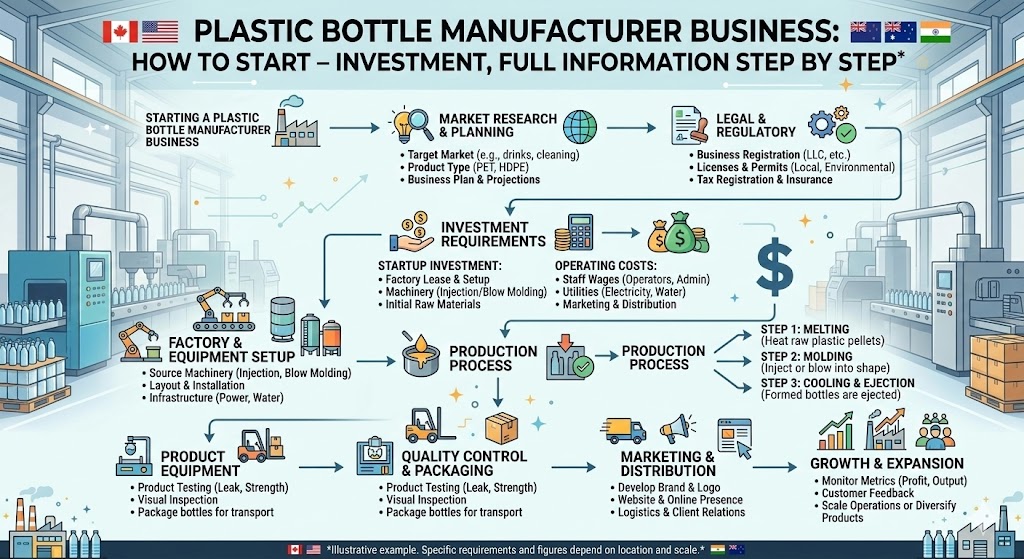 Plastic bottle manufacturing Business is one of the fastest-growing industrial businesses because plastic bottles are widely used in industries like drinking water, beverages, pharmaceuticals, cosmetics, chemicals, and household products. With increasing demand for packaged products, the requirement for plastic bottles is continuously rising in countries like India, USA, Canada, Australia, and New Zealand. Starting a plastic bottle manufacturing business can be highly profitable if it is planned properly with the right machinery, investment, and marketing strategy. This business can be started on a small scale, medium scale, or large industrial level depending on your budget and production capacity. Plastic bottles are mainly made using PET, HDPE, and PP plastic materials which are durable, lightweight, and easy to recycle.