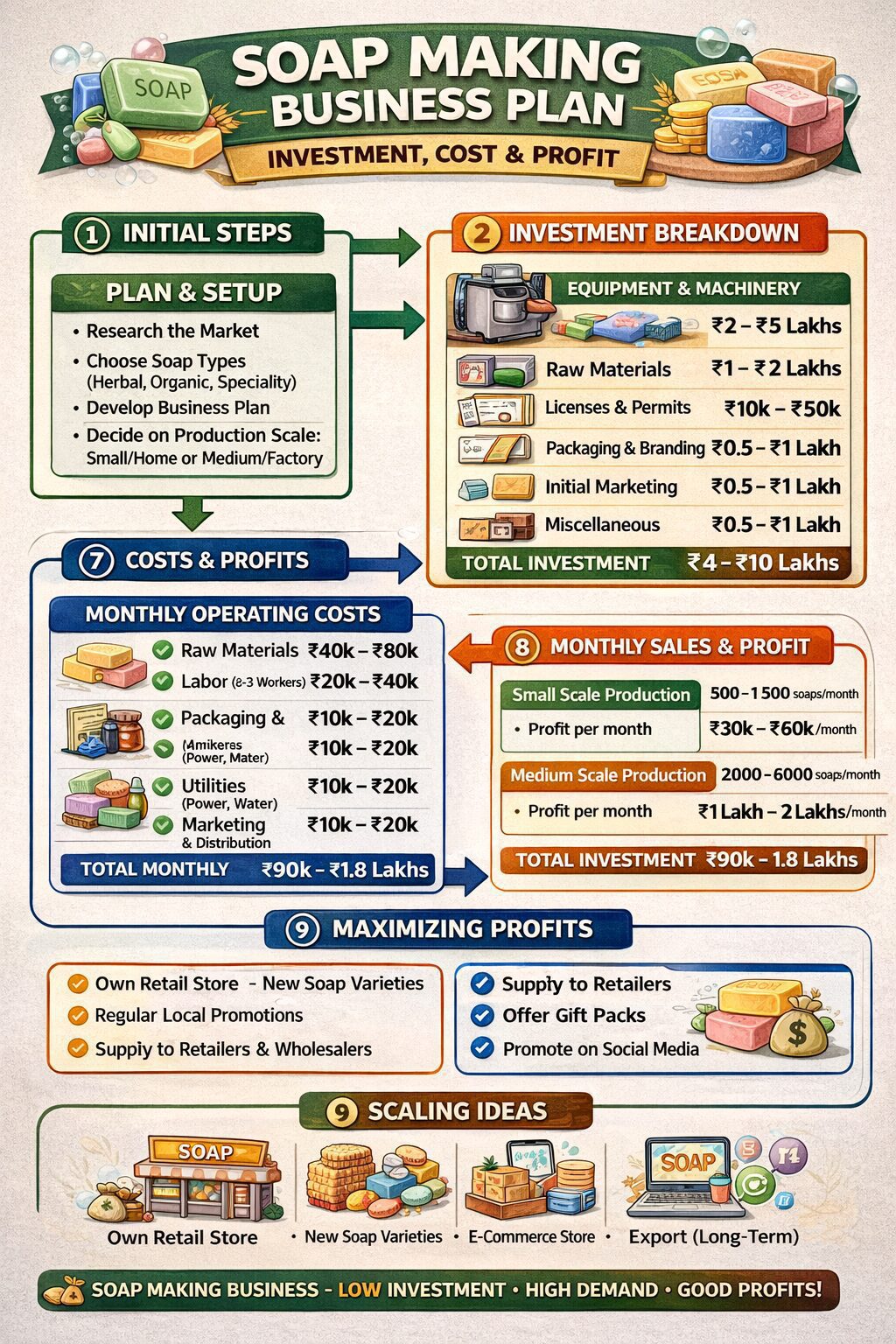 Major cost heads: oils/fats + lye, fragrances/essential oils, colors/additives, molds/cutters, weighing scale, stick blender/mixer, curing racks, packaging, labels, testing/registration, marketing, and working capital.