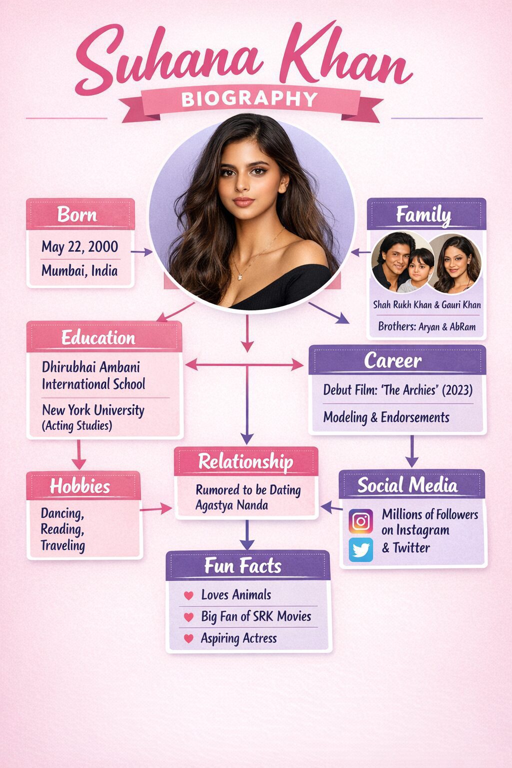 2023 mein Zoya Akhtar ki “The Archies” ne unhe Bollywood mein entry di, jahaan Veronica Lodge role ne critical acclaim paaya, alongside Khushi Kapoor aur Agastya Nanda. History mein controversies bhi rahe, jaise body-shaming trolls aur dating rumors, but Suhana ne resilience dikhayi, saying “I focus on my work, not negativity.” 2025 tak, unki popularity endorsements aur upcoming films se badh rahi hai, making her a self-made star in Khan family legacy.