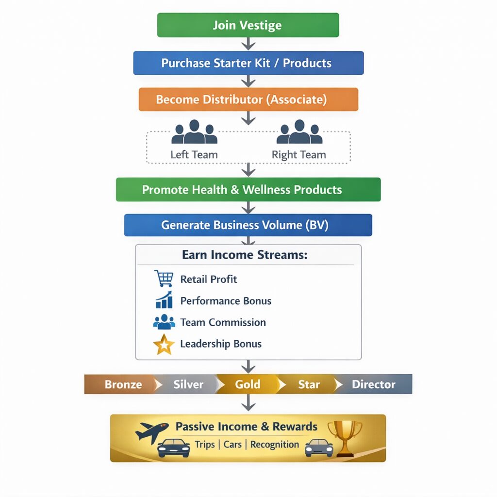 Vestige operates on a multi-level marketing structure. Income is generated through:
