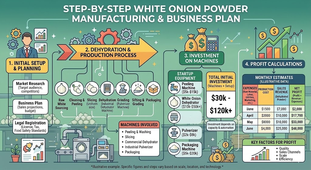 The white onion powder manufacturing business is a high-demand agro-processing industry with strong export potential. With an investment of $15,000 to $40,000 in machinery, entrepreneurs can start a small-scale production unit. The global market is expanding due to the increasing demand for ready-to-eat foods, seasoning mixes, and packaged snacks. By focusing on quality production, proper dehydration technology, and strong export marketing, this business can generate 30–40% profit margins and long-term growth opportunities.